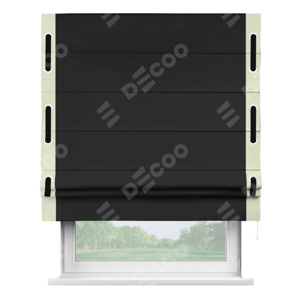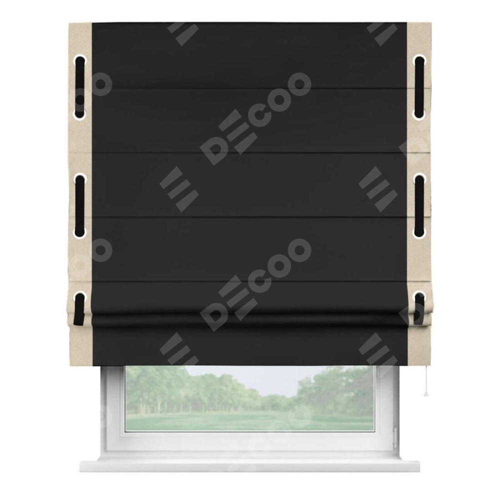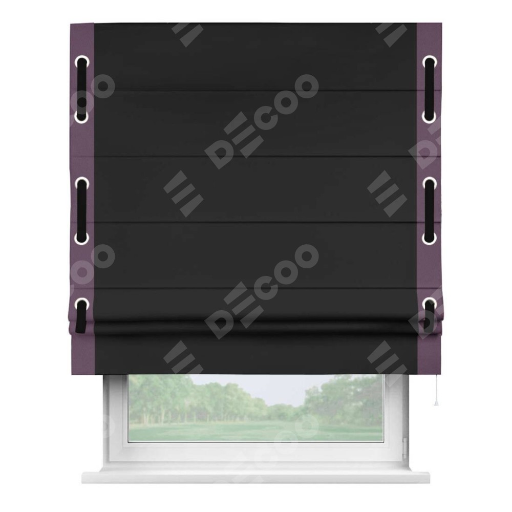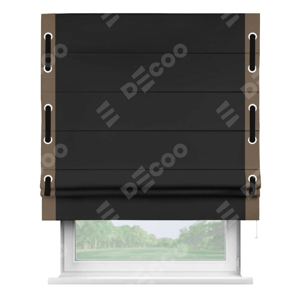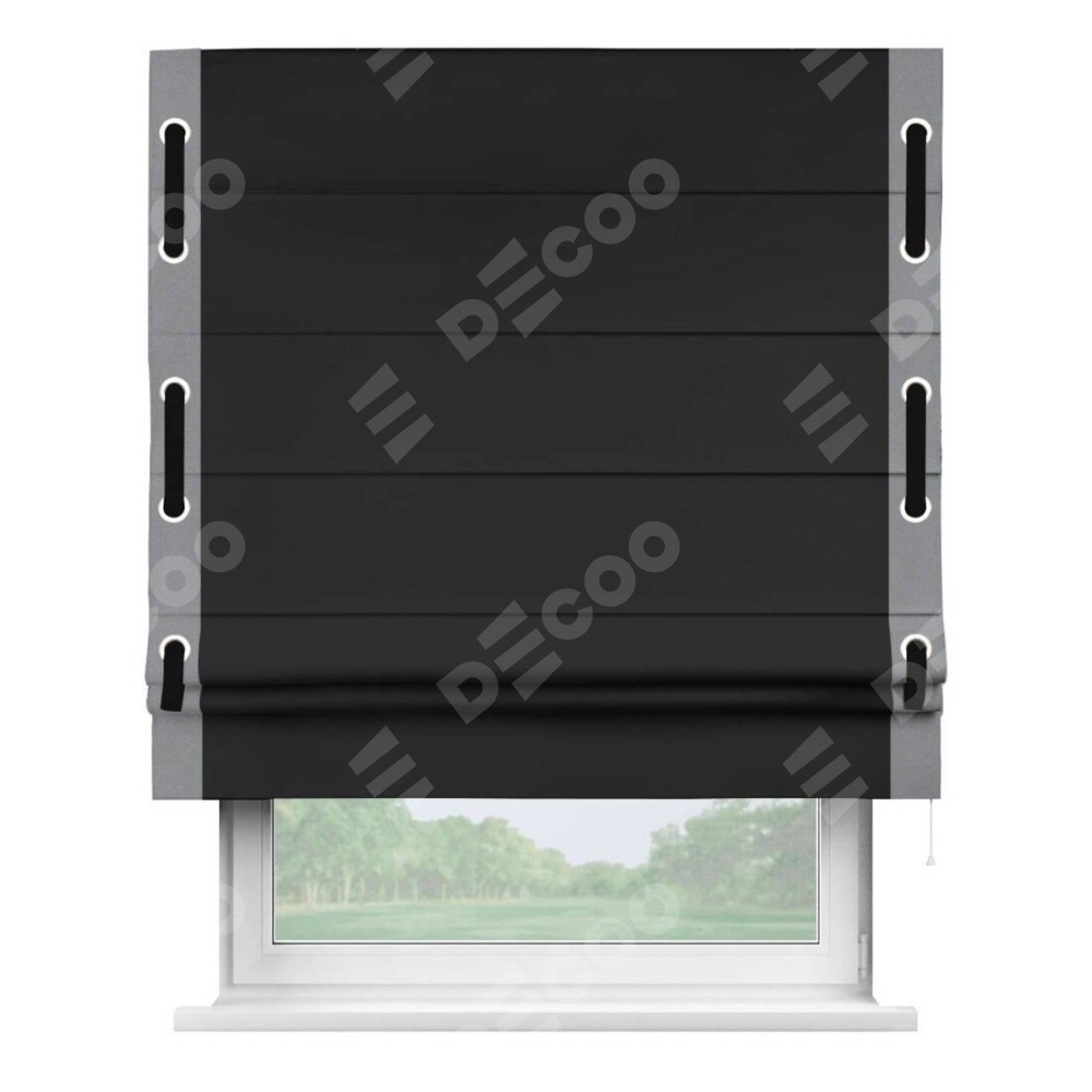 Римская штора «Cortin» для проёма, блэкаут однотонный черный с кантом Стрим Дуо (люверсы с пояском)