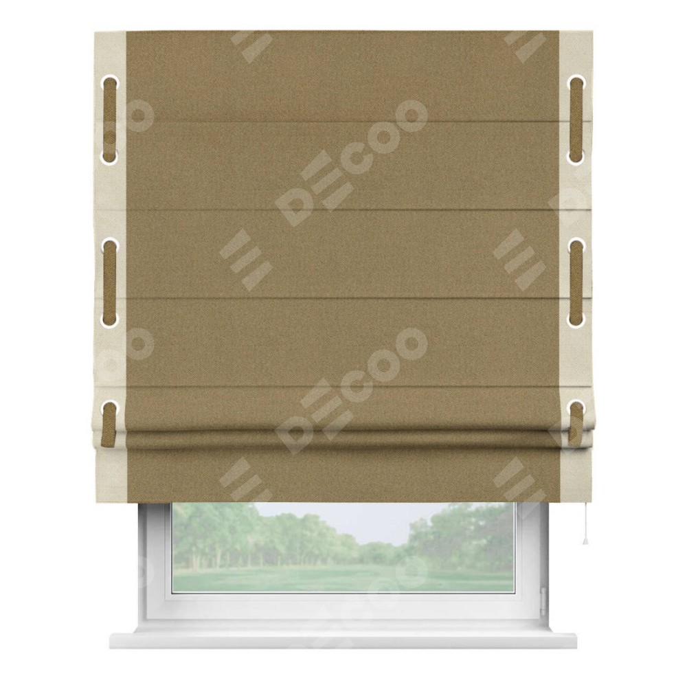 Римская штора производителя «Cortin», используется для проёма, пошита из ткани лён димаут оливковый, артикул 16243. Отделка шторы кантом «Стрим Дуо» на кантах расположены люверсы с пояском, ткань для канта используется лён димаут разной расцветки на выбор. Ткань для пояска обычно используется из основной ткани шторы, а так же можно сделать из любой расцветки по желанию. Имеет универсальный механизм и подходит для монтажа: на потолок, на стену и в нишу.