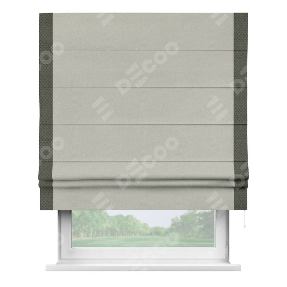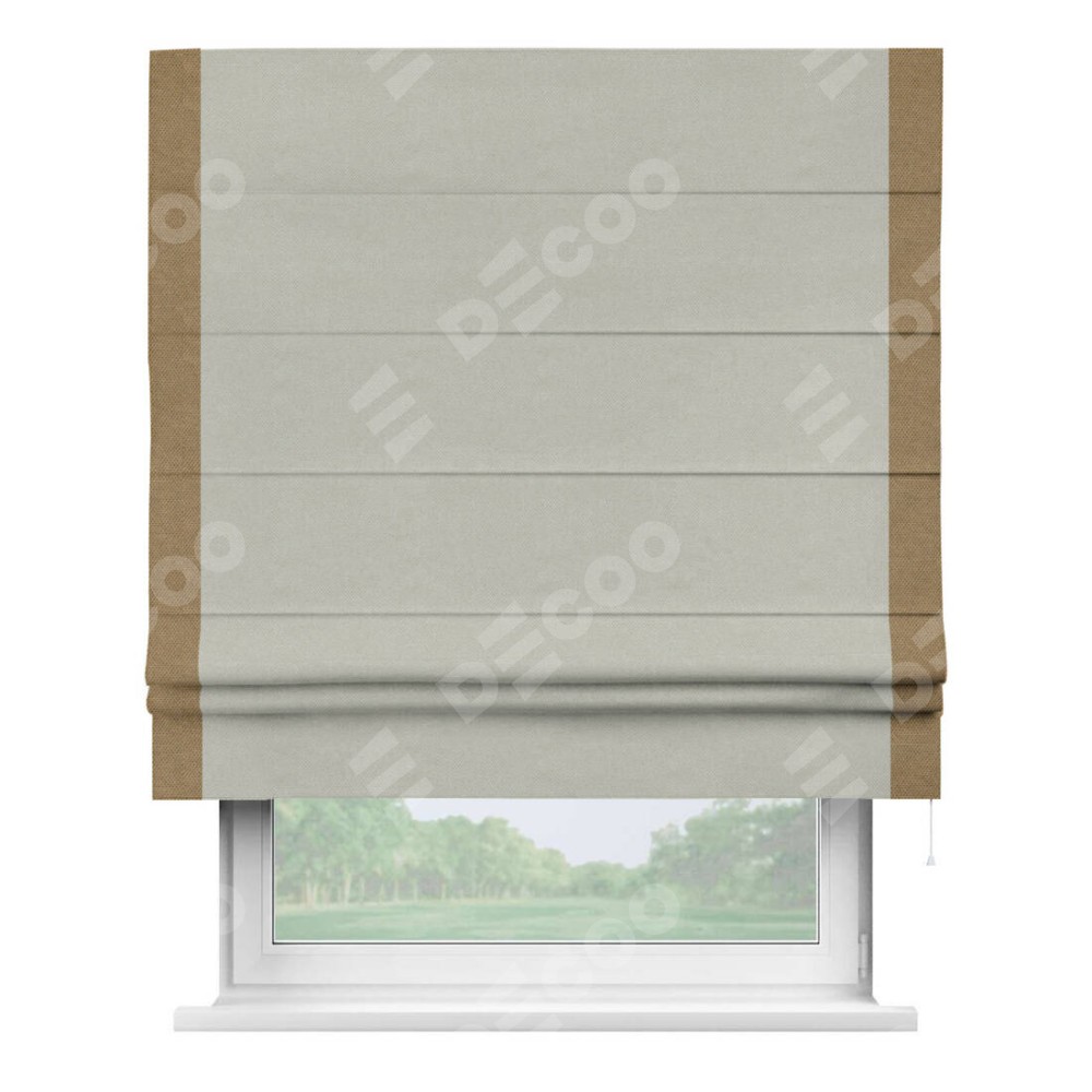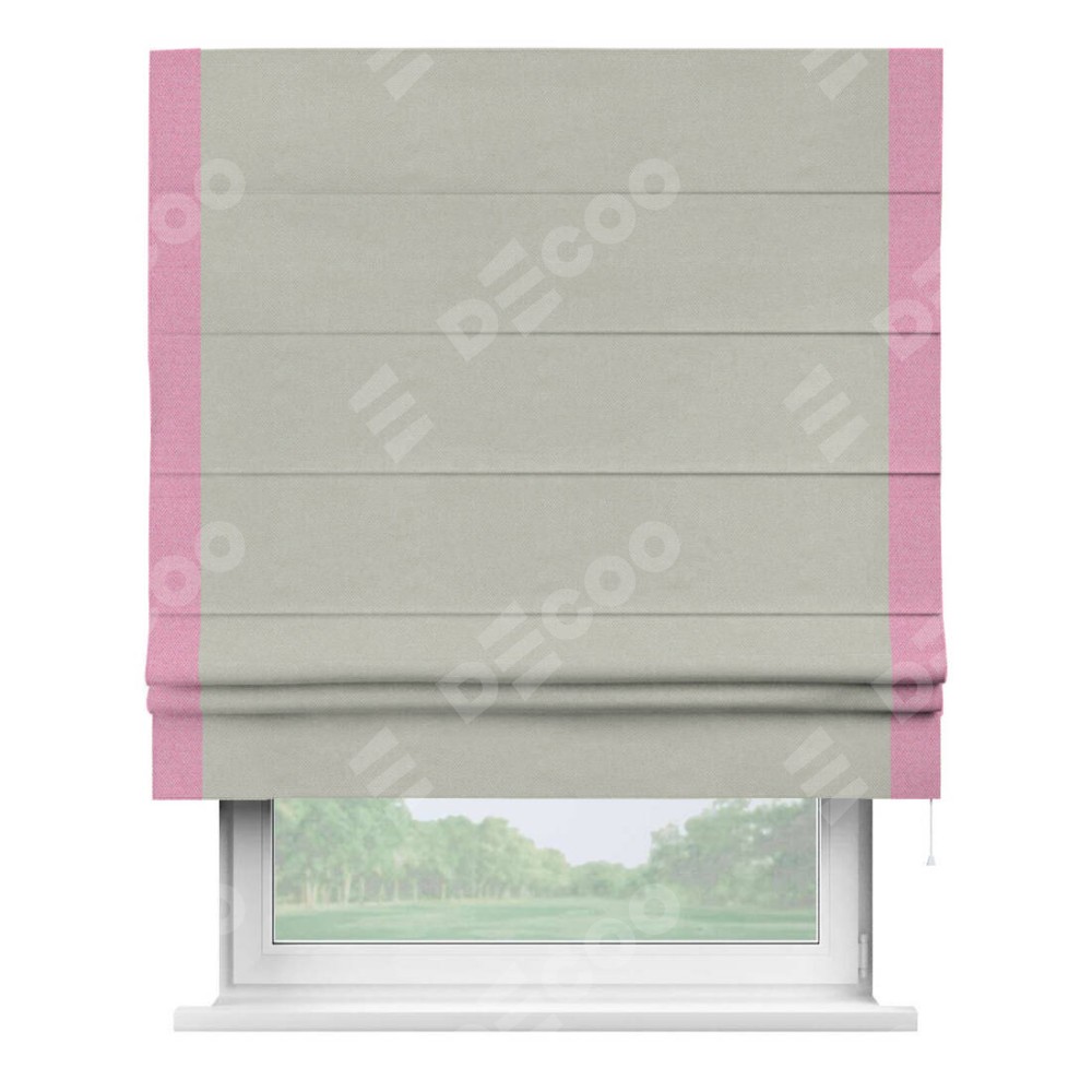 Римская штора производителя «Cortin», используется для проёма, пошита из ткани лён димаут светло-серый, артикул 83025. Отделка шторы кантом «Стрим Дуо», ткань для канта используется из льна димаут разной расцветки на выбор. Имеет универсальный механизм и подходит для монтажа: на потолок, на стену и в нишу.