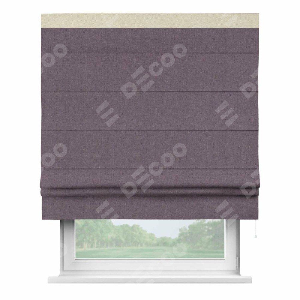 Римская штора производителя «Cortin», используется для проёма, пошита из ткани лён димаут светло-фиолетовый, артикул 83034. Отделка шторы кантом «Кинг», ткань для канта используется из льна димаут разной расцветки на выбор. Имеет универсальный механизм и подходит для монтажа: на потолок, на стену и в нишу.