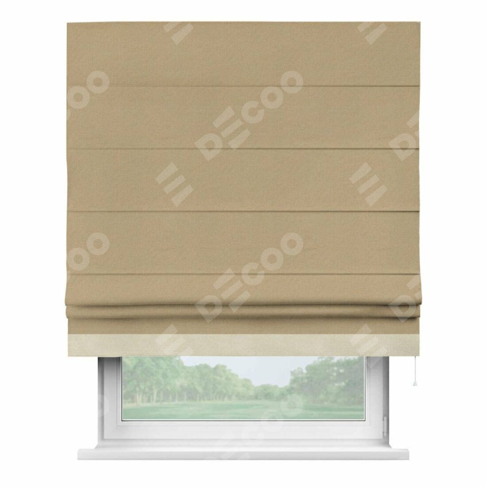 Римская штора производителя «Cortin», используется для проёма, пошита из ткани лён димаут тёмно-бежевый, артикул 83037. Отделка шторы кантом «Джестер», ткань для канта используется из льна димаут разной расцветки на выбор. Имеет универсальный механизм и подходит для монтажа: на потолок, на стену и в нишу.