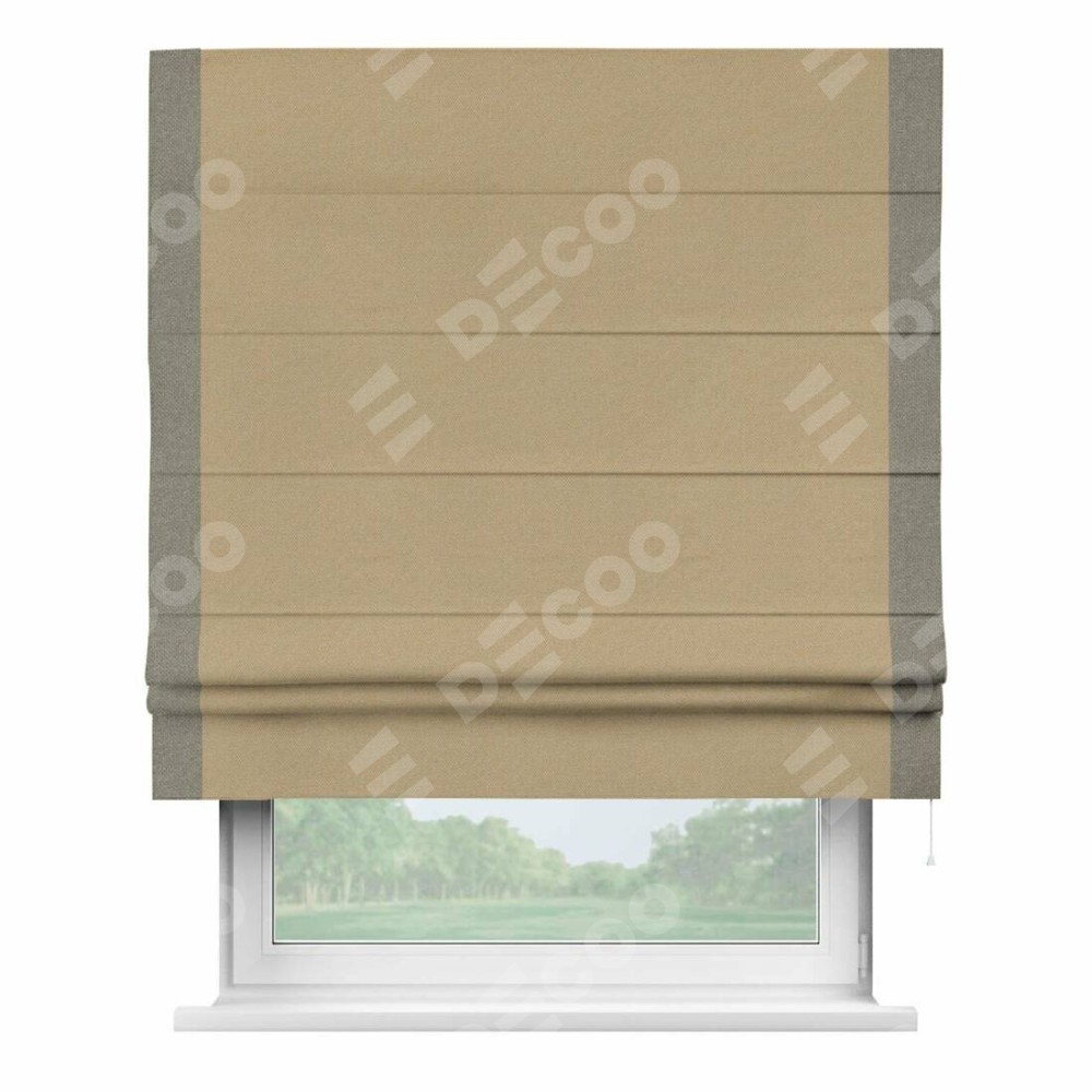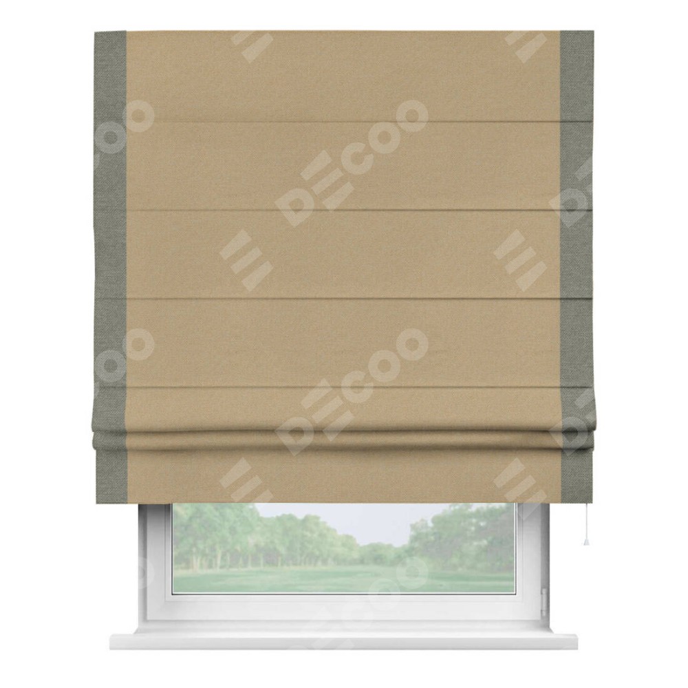 Римская штора производителя «Cortin», используется для проёма, пошита из ткани лён димаут тёмно-бежевый, артикул 83037. Отделка шторы кантом «Стрим Дуо», ткань для канта используется из льна димаут разной расцветки на выбор. Имеет универсальный механизм и подходит для монтажа: на потолок, на стену и в нишу.