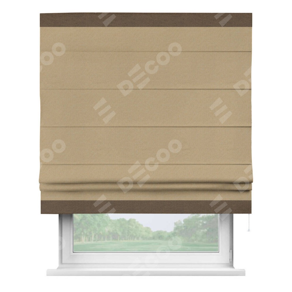 Римская штора производителя «Cortin», используется для проёма, пошита из ткани лён димаут тёмно-бежевый, артикул 83037. Отделка шторы кантом «Горизонт», ткань для канта используется из льна димаут разной расцветки на выбор. Имеет универсальный механизм и подходит для монтажа: на потолок, на стену и в нишу.