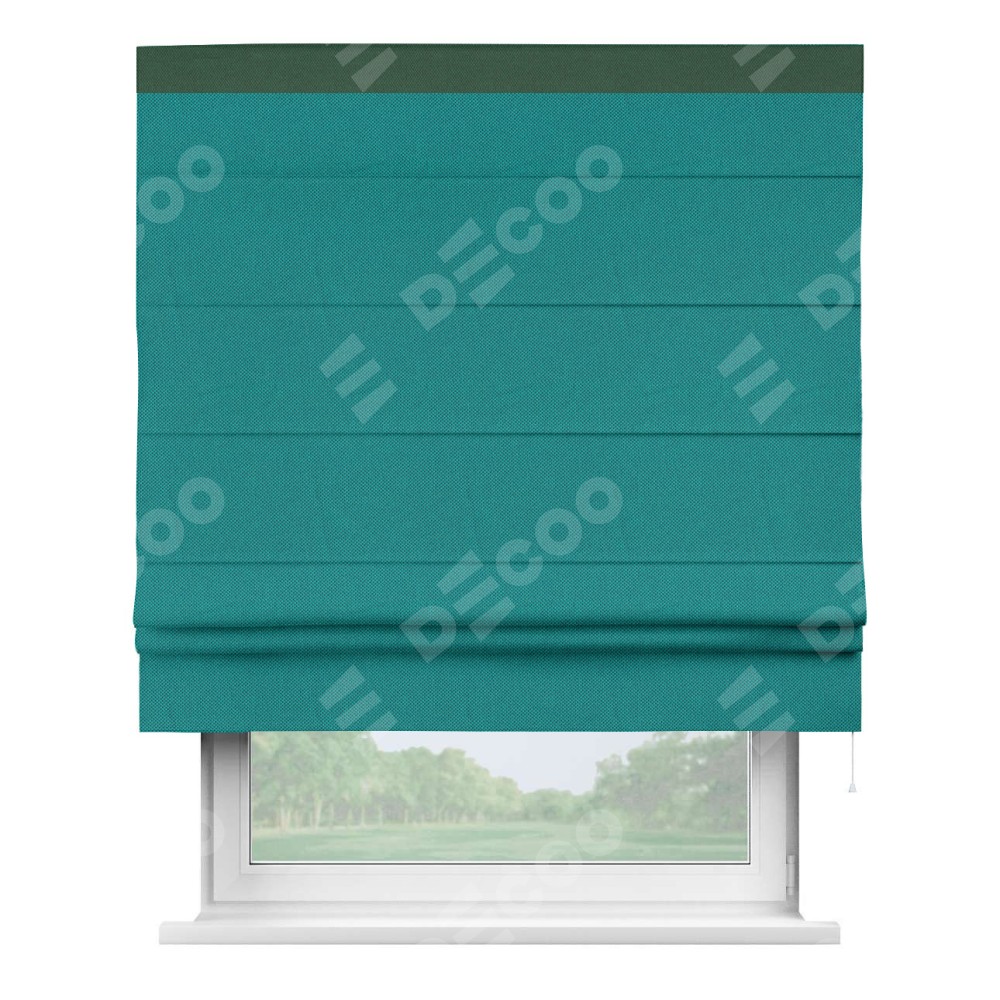 Римская штора производителя «Cortin», используется для проёма, пошита из ткани лён димаут тёмно-бирюзовый, артикул 318. Отделка шторы кантом «Кинг», ткань для канта используется из льна димаут разной расцветки на выбор. Имеет универсальный механизм и подходит для монтажа: на потолок, на стену и в нишу.