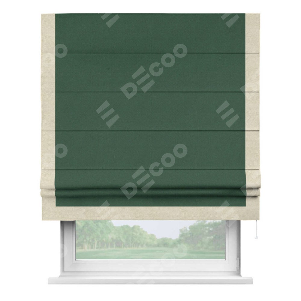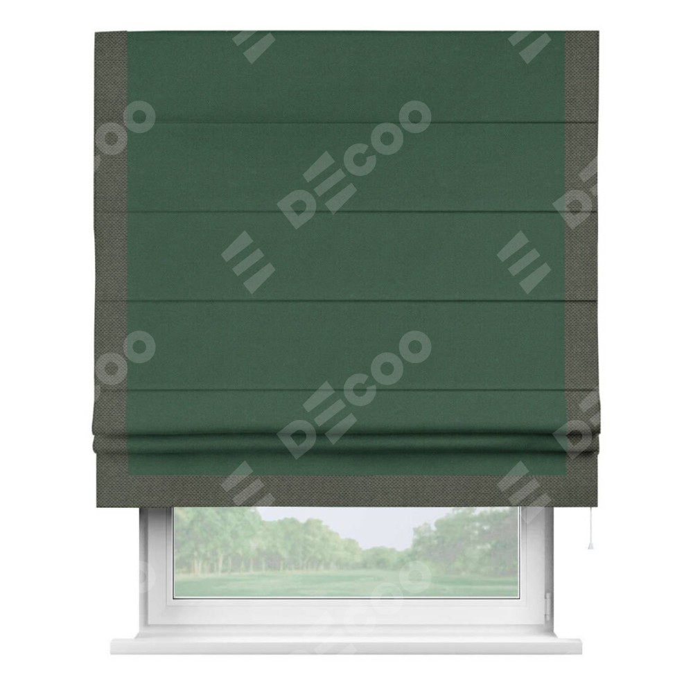 Римская штора производителя «Cortin», используется для проёма, пошита из ткани лён димаут тёмно-зелёный, артикул 16246. Отделка шторы кантом «Виктория», ткань для канта используется из льна димаут разной расцветки на выбор. Имеет универсальный механизм и подходит для монтажа: на потолок, на стену и в нишу.