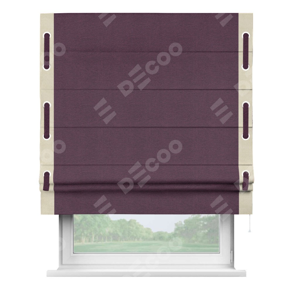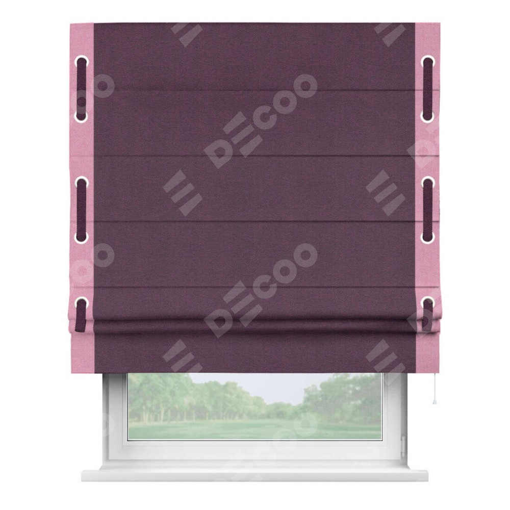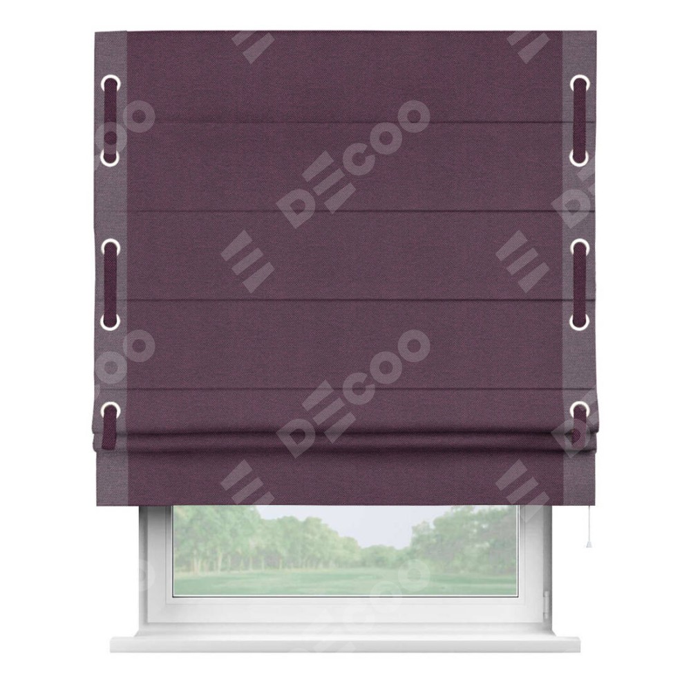 Римская штора производителя «Cortin», используется для проёма, пошита из ткани лён димаут фиолетовый, артикул 8817. Отделка шторы кантом «Стрим Дуо» на кантах расположены люверсы с пояском, ткань для канта используется лён димаут разной расцветки на выбор. Ткань для пояска обычно используется из основной ткани шторы, а так же можно сделать из любой расцветки по желанию. Имеет универсальный механизм и подходит для монтажа: на потолок, на стену и в нишу.