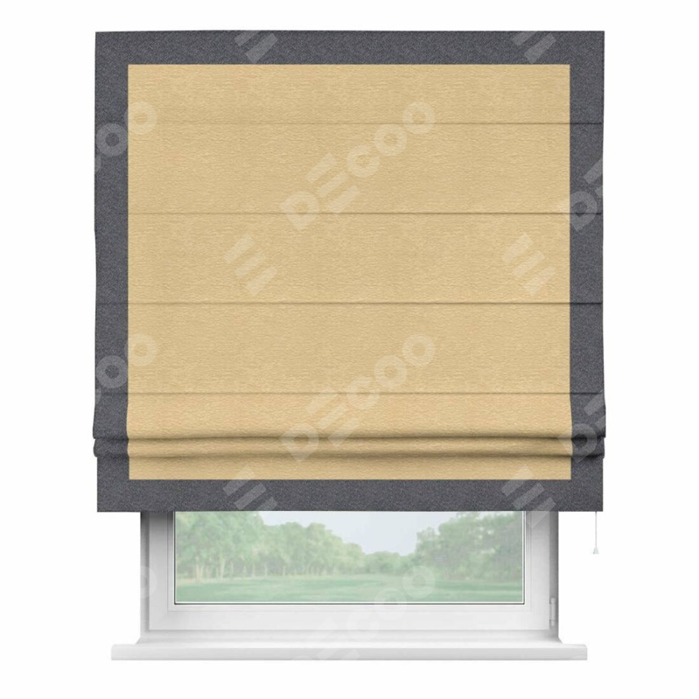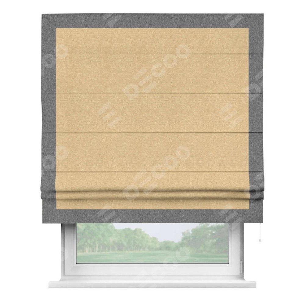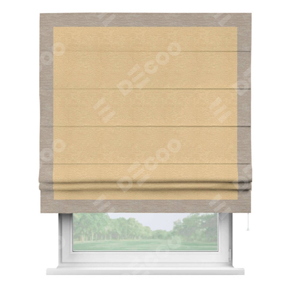 Римская штора производителя «Cortin», используется для проёма, пошита из ткани софт однотонный бежевый, артикул 4202 05. Отделка шторы кантом «Чесс», ткань для канта используется из софта разной расцветки на выбор. Имеет универсальный механизм и подходит для монтажа: на потолок, на стену и в нишу.