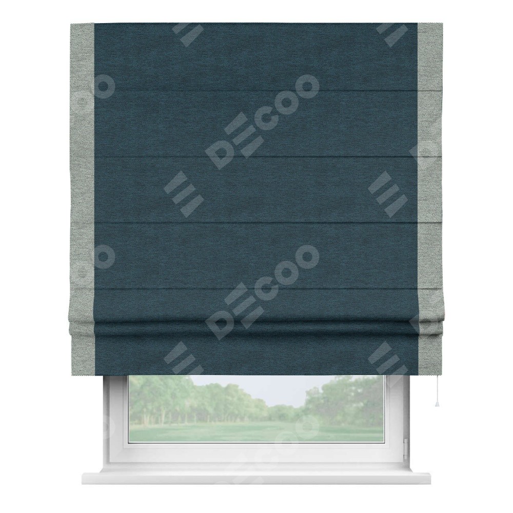 Римская штора производителя «Cortin», используется для проёма, пошита из ткани твид блэкаут глубокий синий, артикул 21590. Отделка шторы кантом «Стрим Дуо», ткань для канта используется из твида разной расцветки на выбор. Имеет универсальный механизм и подходит для монтажа: на потолок, на стену и в нишу.