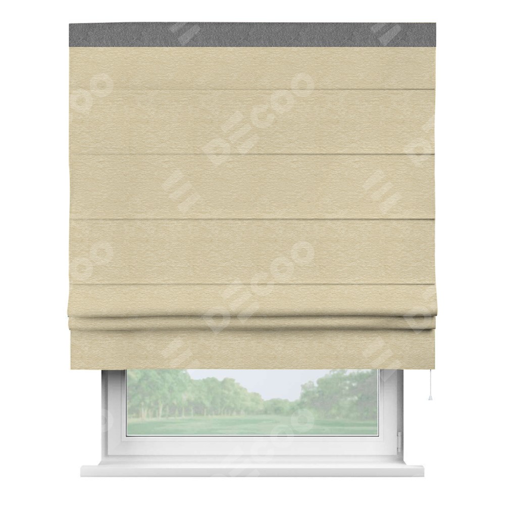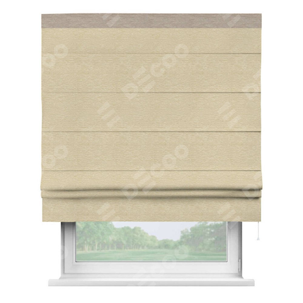 Римская штора производителя «Cortin», используется для проёма, пошита из ткани софт однотонный светло-бежевый, артикул 54426. Отделка шторы кантом «Кинг», ткань для канта используется из софта разной расцветки на выбор. Имеет универсальный механизм и подходит для монтажа: на потолок, на стену и в нишу.