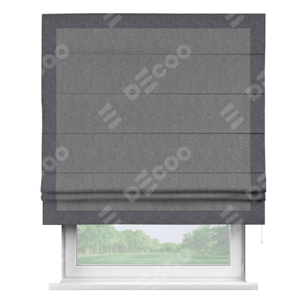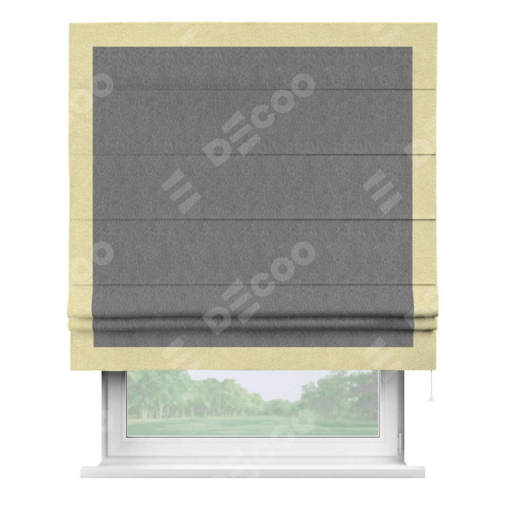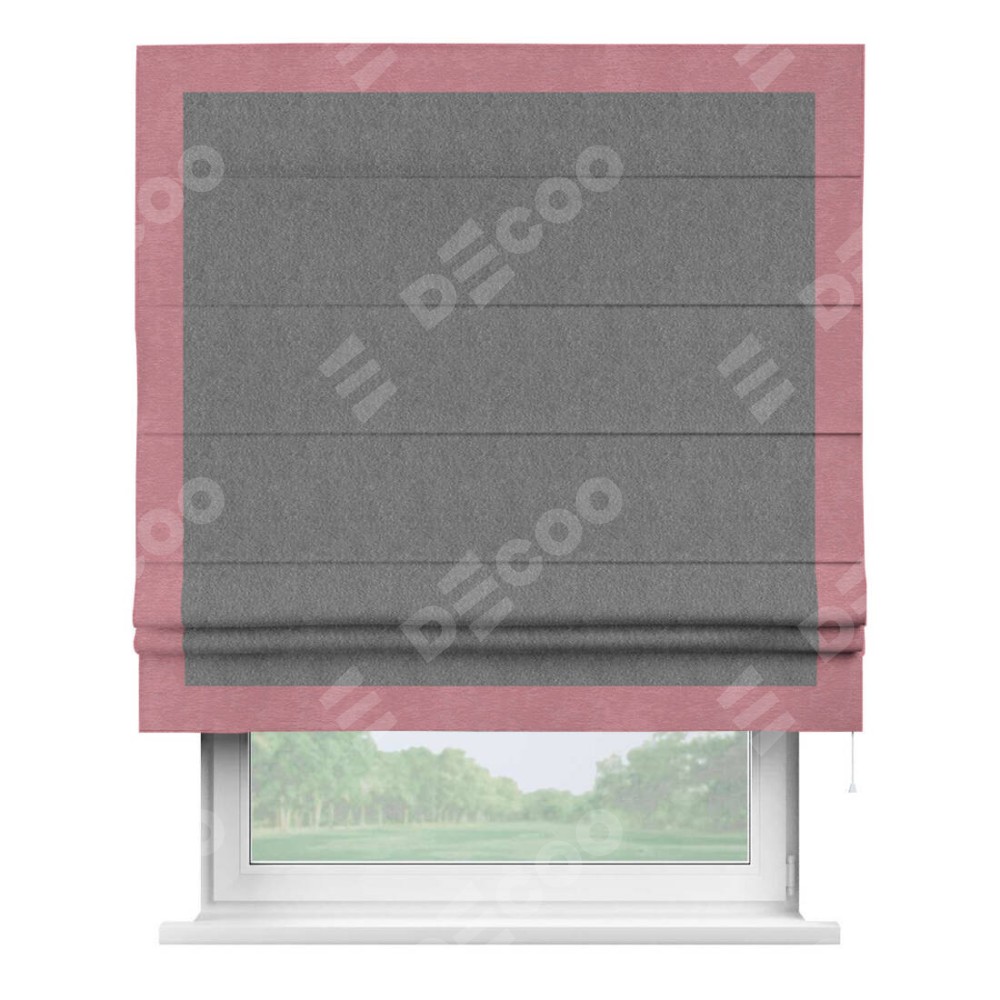 Римская штора производителя «Cortin», используется для проёма, пошита из ткани софт однотонный серый, артикул 70605. Отделка шторы кантом «Чесс», ткань для канта используется из софта разной расцветки на выбор. Имеет универсальный механизм и подходит для монтажа: на потолок, на стену и в нишу.