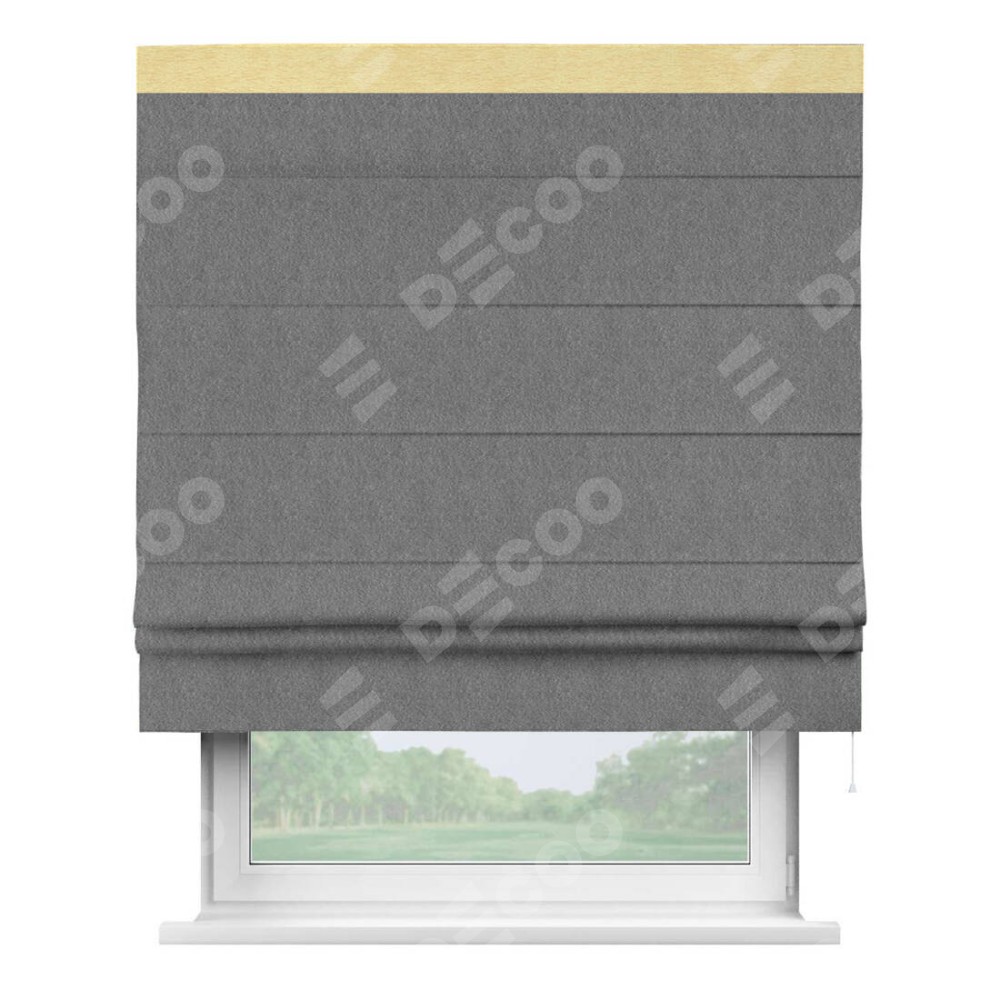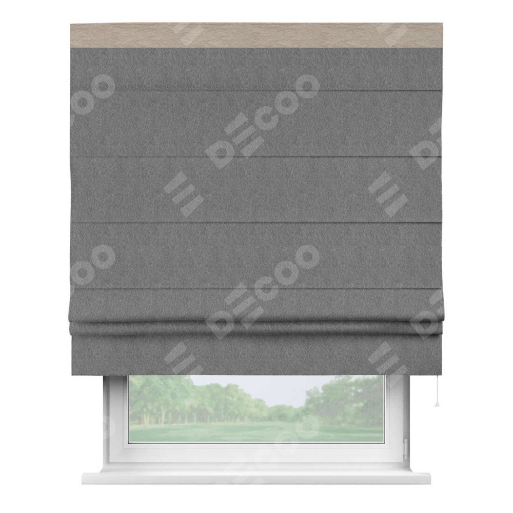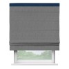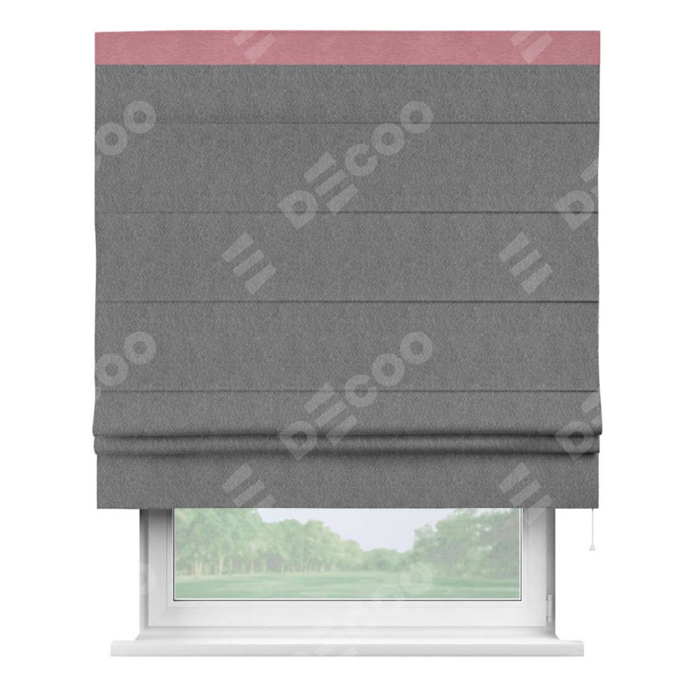 Римская штора производителя «Cortin», используется для проёма, пошита из ткани софт однотонный серый, артикул 70605. Отделка шторы кантом «Кинг», ткань для канта используется из софта разной расцветки на выбор. Имеет универсальный механизм и подходит для монтажа: на потолок, на стену и в нишу.