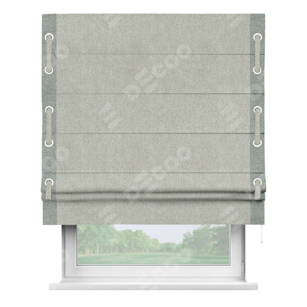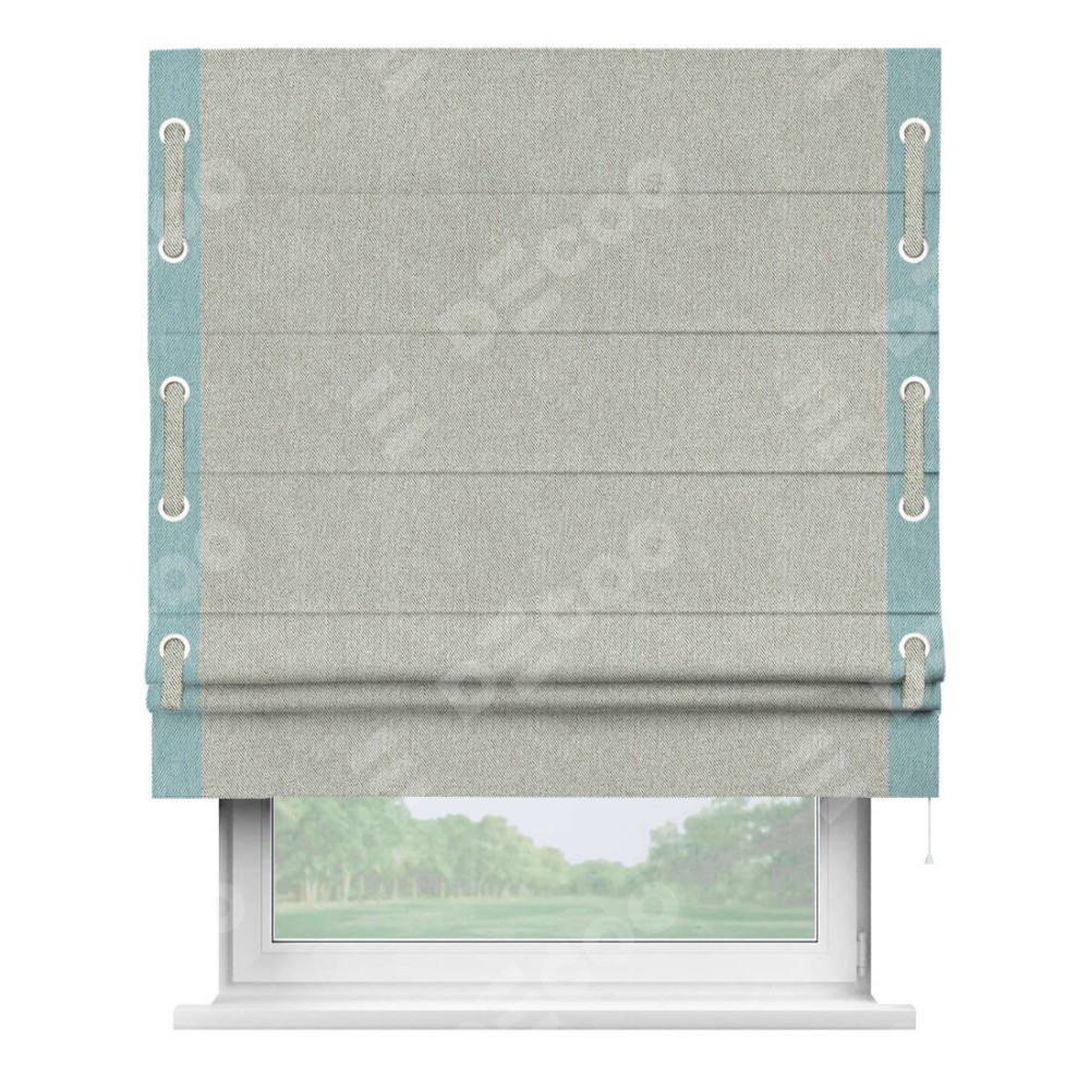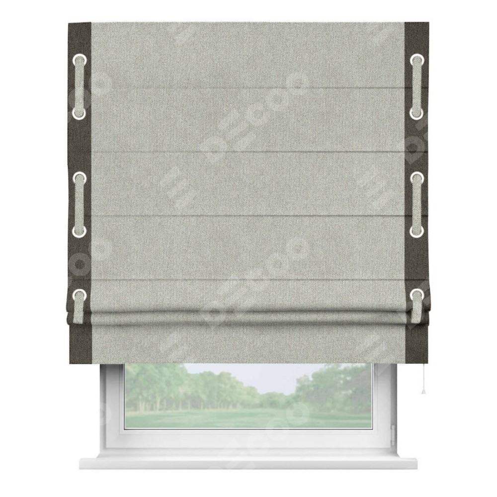 Римская штора производителя «Cortin», используется для проёма, пошита из ткани твид блэкаут глубокий коричнево-серый, артикул 21574. Отделка шторы кантом «Стрим Дуо» на кантах расположены люверсы с пояском, ткань для канта используется из твида разной расцветки на выбор. Ткань для пояска обычно используется из основной ткани шторы, а так же можно сделать из любой расцветки по желанию. Имеет универсальный механизм и подходит для монтажа: на потолок, на стену и в нишу.