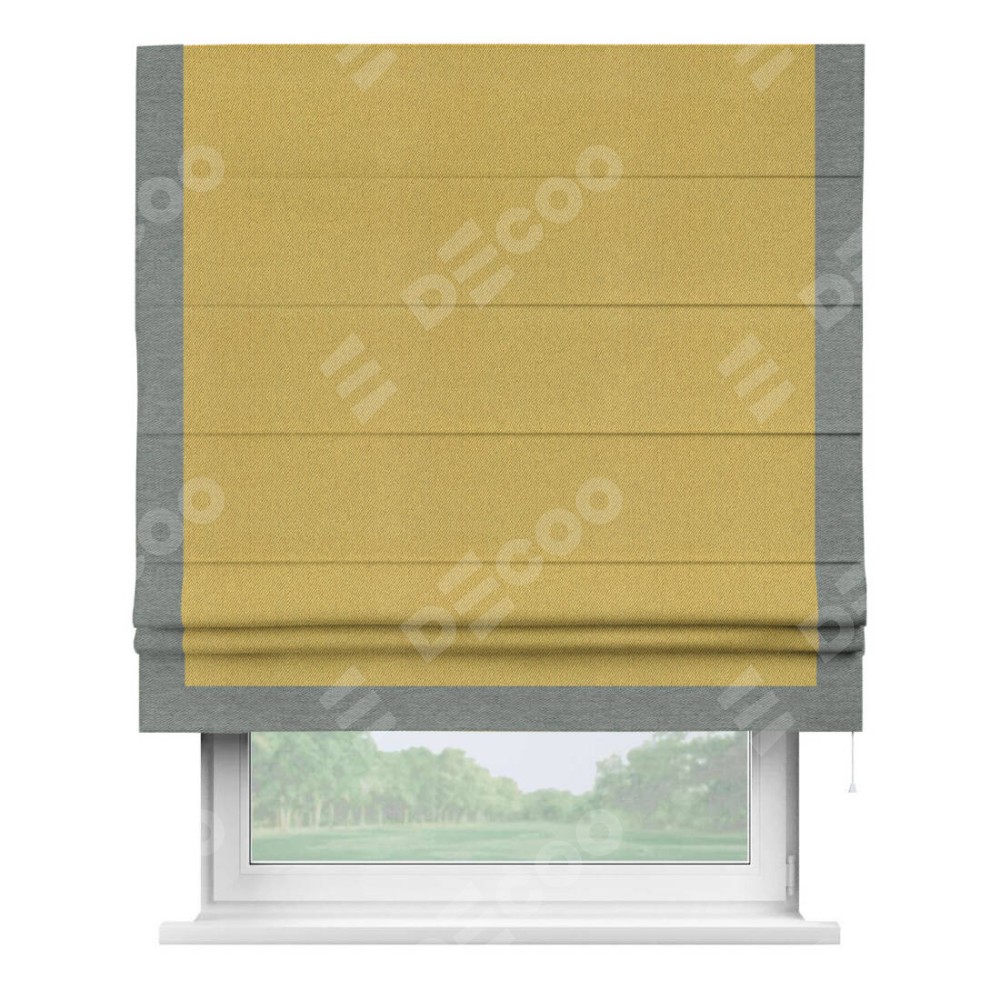 Римская штора производителя «Cortin», используется для проёма, пошита из ткани твид блэкаут пыльная горчица, артикул 21588. Отделка шторы кантом «Виктория», ткань для канта используется из твида разной расцветки на выбор. Имеет универсальный механизм и подходит для монтажа: на потолок, на стену и в нишу.