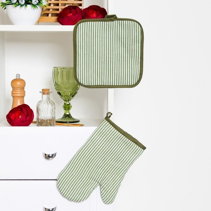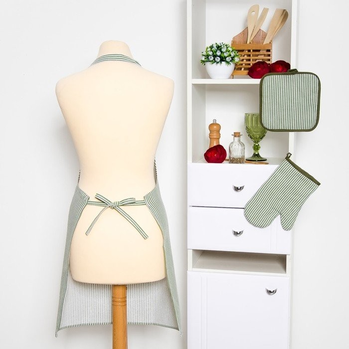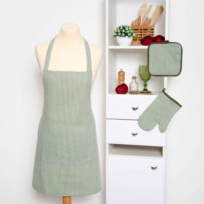 Набор Доляна фартук/прихватка/варежка, Зеленая полоска, 100%пэ, рогожка 200 гр/м