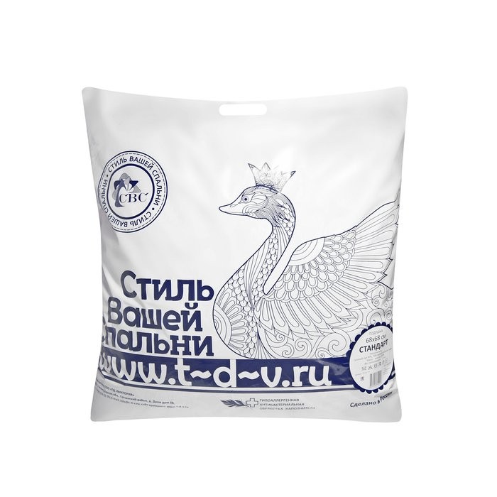 Ткань верха: пуходержащий хлопковый тик. Наполнитель: пухоперовая смесь (пух — 30%, перо — 70%). Кант: х/б, атласная этикетка-уголок с логотипом «СВС» на сатине. Поставляется в фирменном пакете с ручкой.