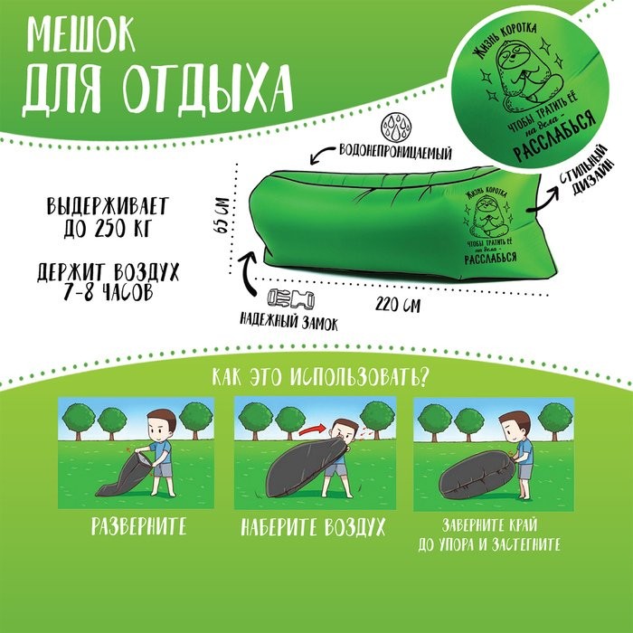 - Благодаря водостойкости удобно использовать вместо пляжного надувного матраса, ведь надувной мешок превосходно держится на воде
